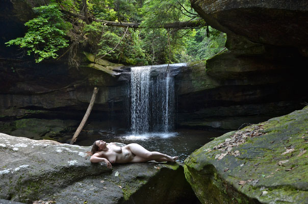 First, when we finally had made our way down the trail and arrived at the waterfall that was our destination, we found it was not free of other people. In fact, we were pretty sure that was going to be the case since the church summer camp group of 8-year-olds and their teachers had passed us along the trail. They were all over the place enjoying the water and the rocks. Now this is not the most visited waterfall in Kentucky by any means. It’s quite possible we and this class were the only visitors there that day, maybe that week. But, of course, we were there at the same time. So we just made ourselves comfortable and waited. Eventually the kids left and headed back up the trail. Don’t know if they saw the rattlesnake on their way out, but I kind of doubt it since I think we might have heard the screams.